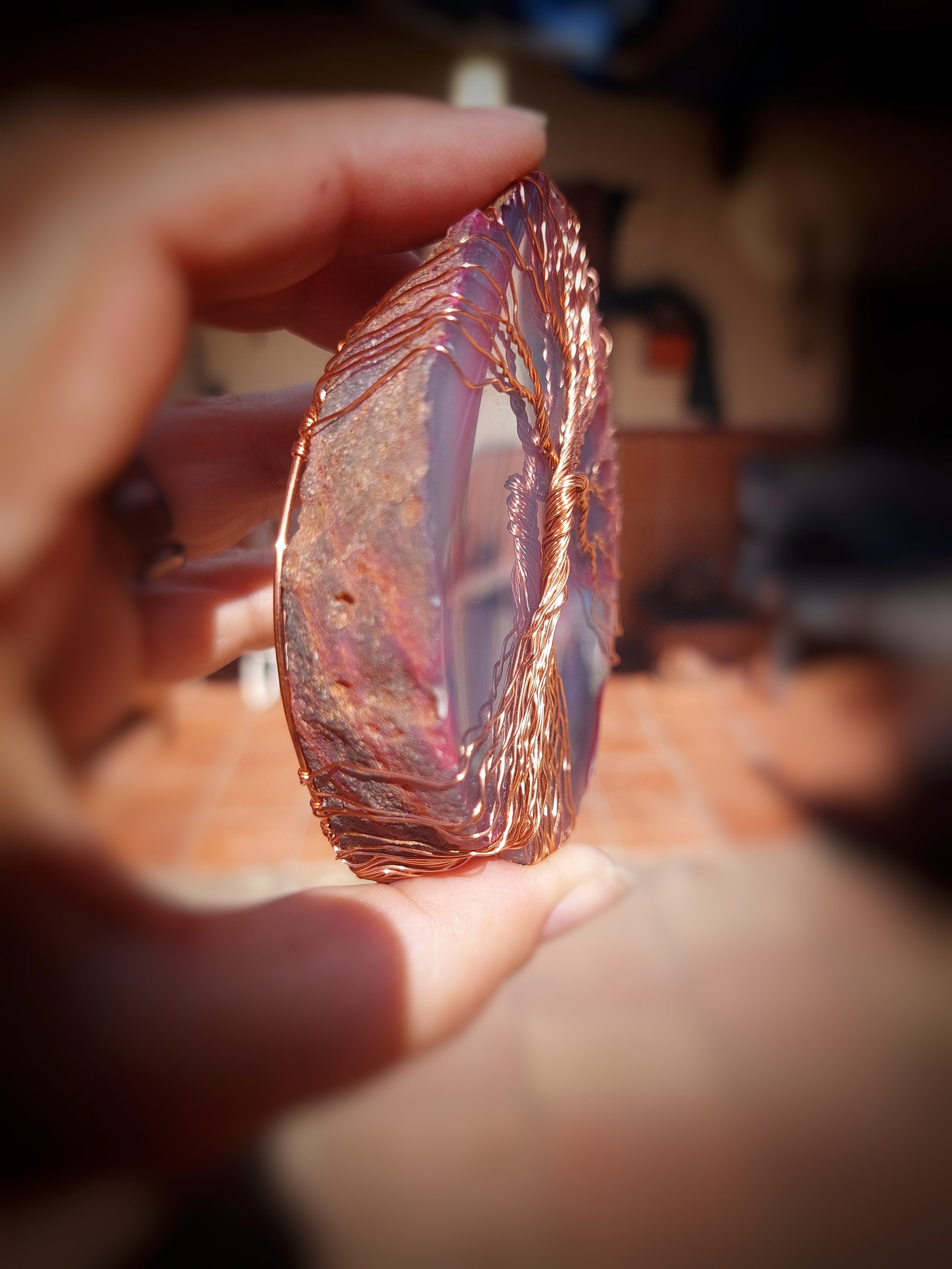Deze Tree Of Life Agaat Suncatcher geeft verschillende effecten afhankelijk van de lichtbron.