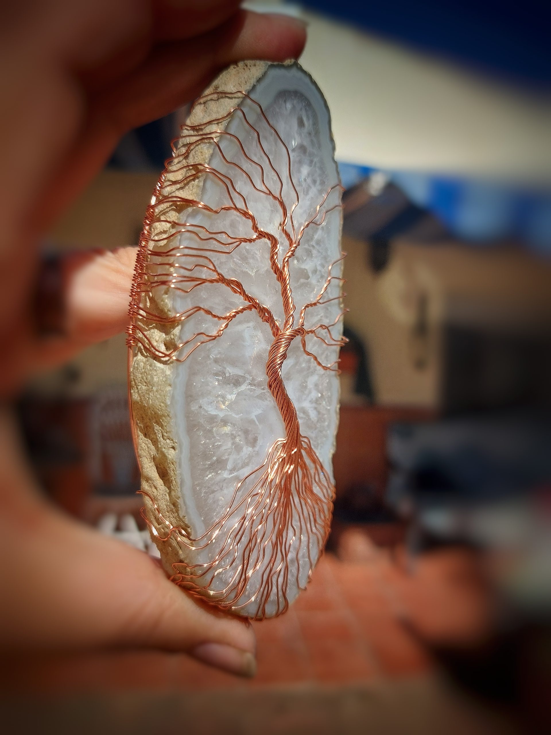 Deze Tree Of Life Agaat Suncatcher geeft verschillende effecten afhankelijk van de lichtbron.