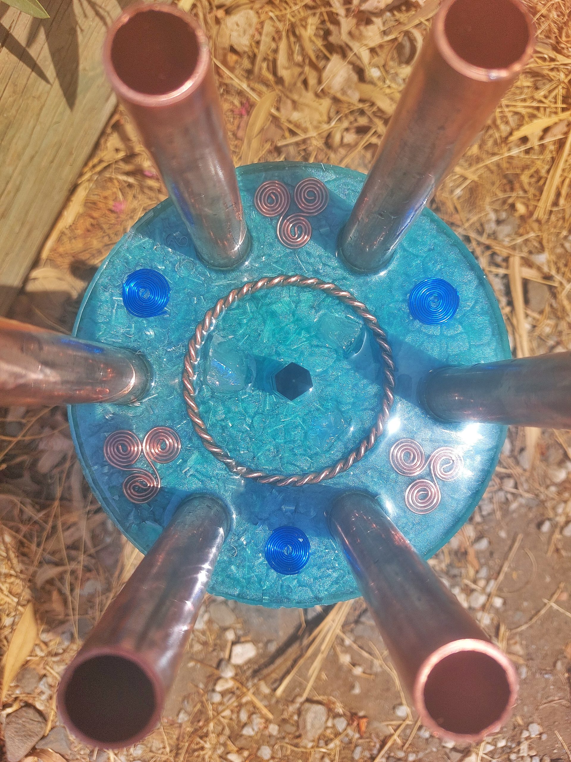 Deze is samengesteld uit metalen, kristallen, epoxy en koperen buizen.